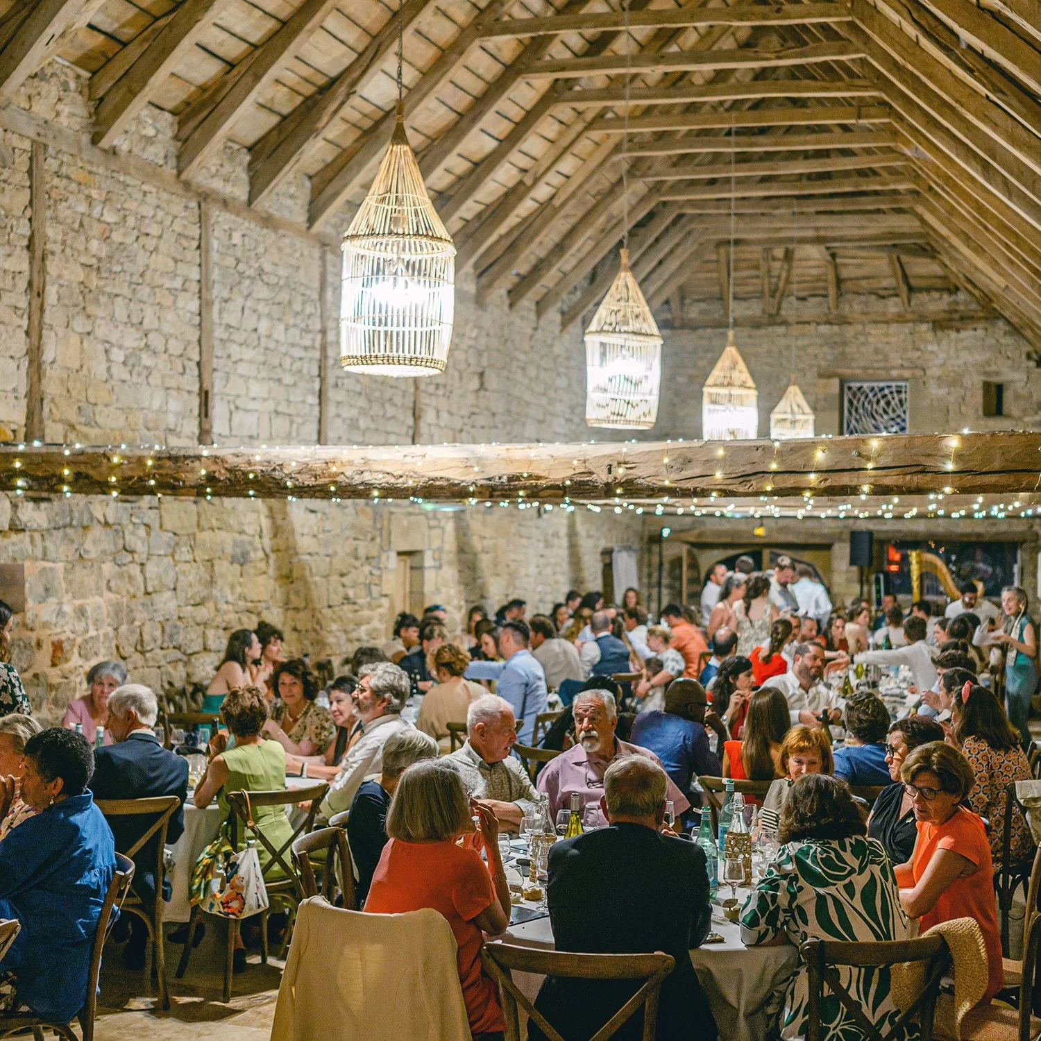 • La Grange de 110m2, avec ses poutres apparentes et sa cuisine équipée. Capacité : environ 120 places assises
